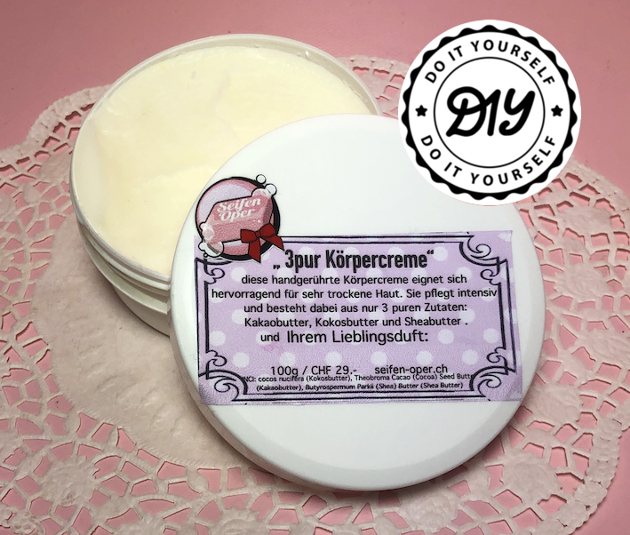 diese handgerührte Körpercreme eignet sich hervorragend für sehr trockene Haut. Sie pflegt intensiv und besteht dabei aus nur 3 puren Zutaten: Kakaobutter, Kokosbutter und Sheabutter . -und Ihrem Lieblingsduft.